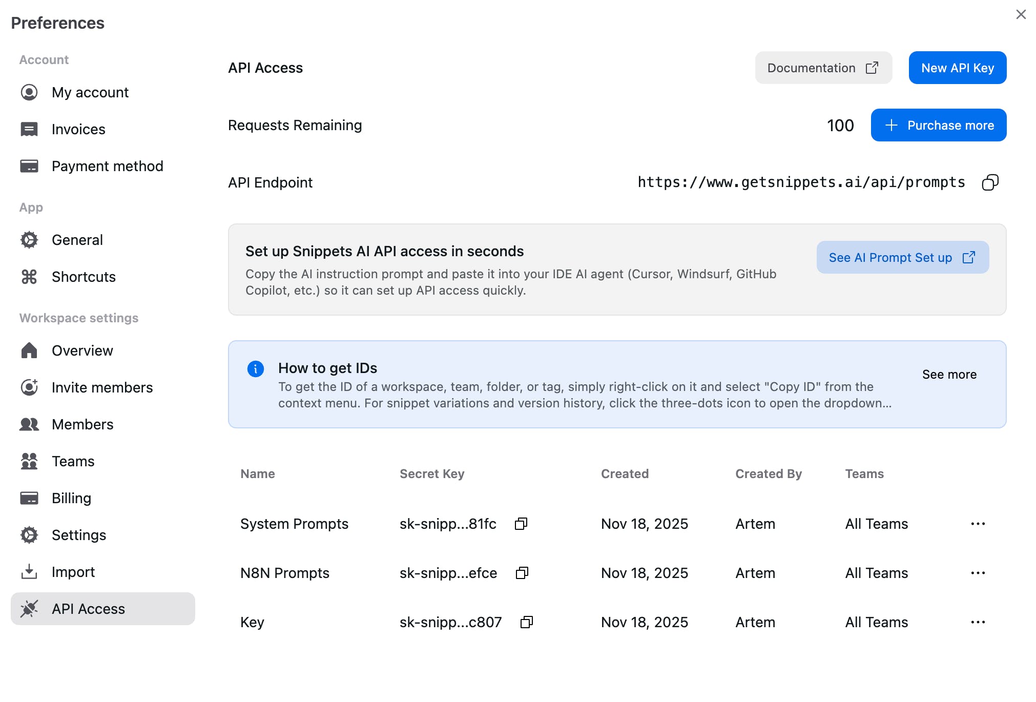 Programmatic integration – Pull prompts directly into your apps and workflows